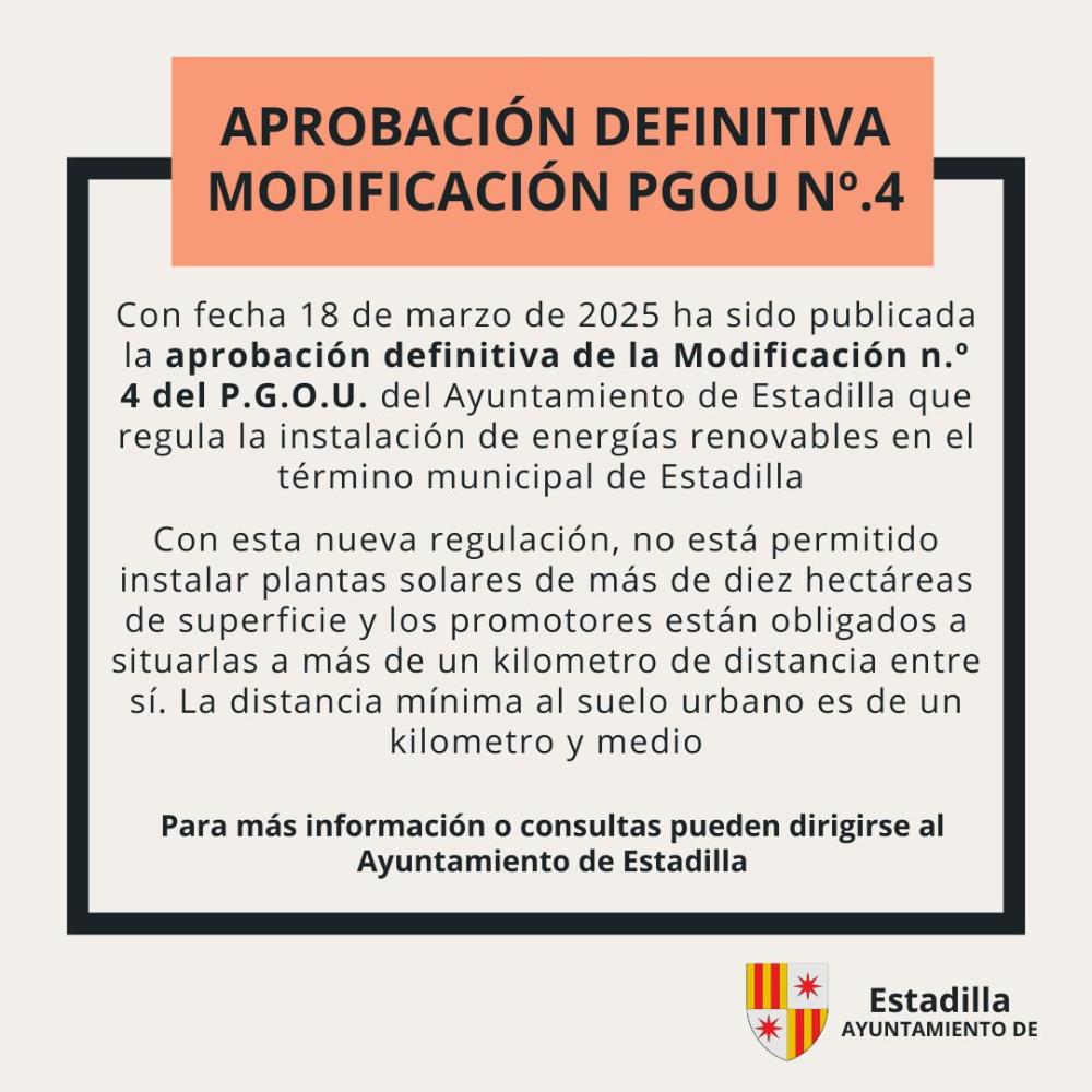El Ayuntamiento de Estadilla informa que el pasado 18 de marzo de 2025 fue publicada la aprobación definitiva de la Modificación n.º 4 del P.G.O.U. del Ayuntamiento de Estadilla que regula la instalación de energías renovables eólicas y fotovoltaicas en el término municipal de Estadilla.