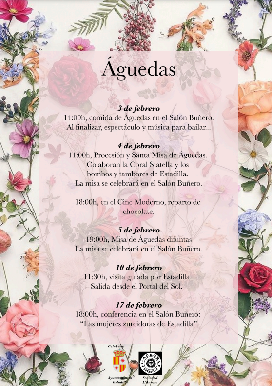 El domingo 4 de febrero, a las 11:00h, desde el Salón Buñero, Procesión y Santa Misa de Águedas. Colaboran la Coral Statella y la Asociación de Bombos y Tambores de Estadilla.