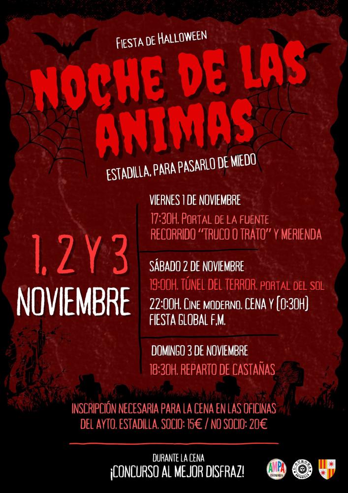 A las 22:00h nos reuniremos para una cena de miedo en el Cine Moderno. Es necesario inscripción previa y pago en las oficinas del Ayuntamiento de Estadilla. Precio socio: 15€ / precio no socio: 20€. Precio infantil: 10€. Plazo máximo: 30 de octubre. Ven disfrazado y prepárate para competir en el concurso al disfraz más terrorífico. Y después de la cena ¡fiesta discomóvil con la GLOBAL F.M. hasta que el cuerpo aguante!