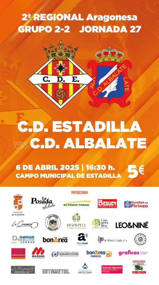 El domingo, 6 de abril, a partir de las 16:30 horas se disputará, en el Campo Municipal, un partido de fútbol entre el C.D. Estadilla y C.D. Albalate.