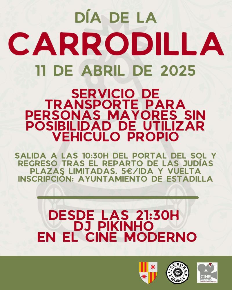 Además, este año continuamos con el servicio de transporte pensado para las personas mayores de Estadilla sin posibilidad de utilizar un vehículo propio. Aquellas personas interesadas pueden inscribirse en las oficinas del Ayuntamiento de Estadilla hasta el miércoles 9 de abril. La salida se realizará a las 10:30h desde el Portal del Sol, para regresar tras el reparto de las judías. Las plazas son limitadas. Precio: 5€/ida y vuelta.
