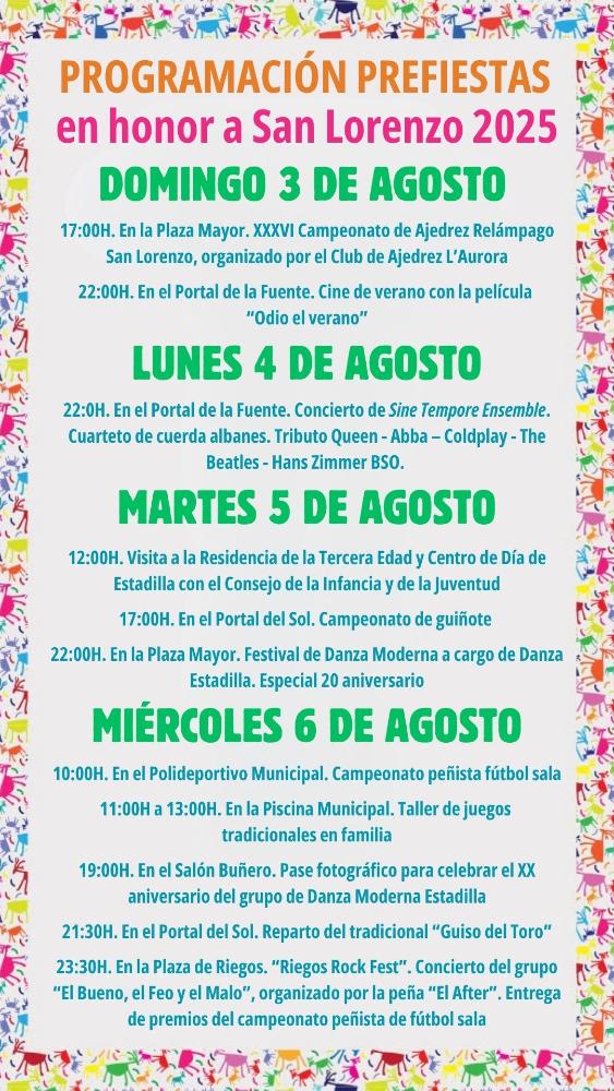 El Ayuntamiento informa que con motivo de la celebración de las fiestas patronales en honor a San Lorenzo 2025 se van a celebrar los siguientes actos prefiestas: