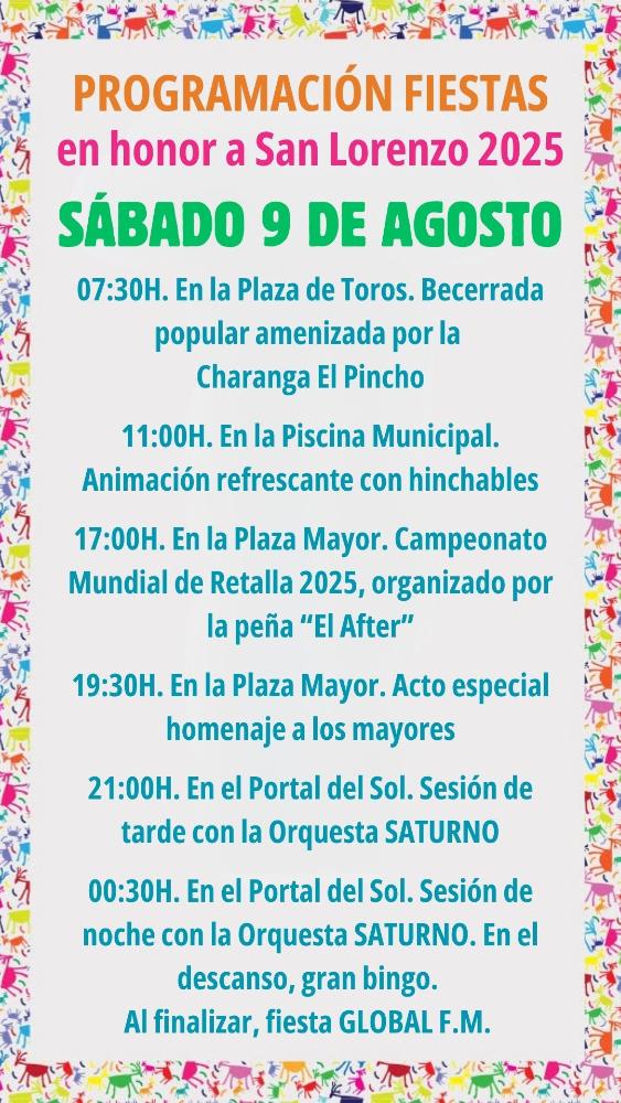 El Ayuntamiento informa que con motivo de la celebración de las fiestas patronales en honor a San Lorenzo 2025, el sábado 9 de agosto, se van a celebrar los siguientes actos festivos: