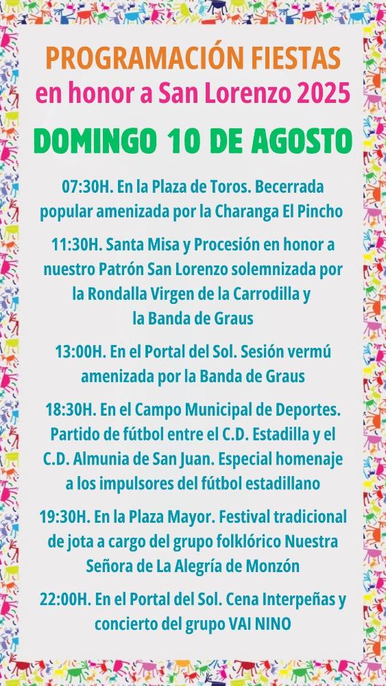 El Ayuntamiento informa que con motivo de la celebración de las fiestas patronales en honor a San Lorenzo 2025, el domingo 10 de agosto, se van a celebrar los siguientes actos festivos: