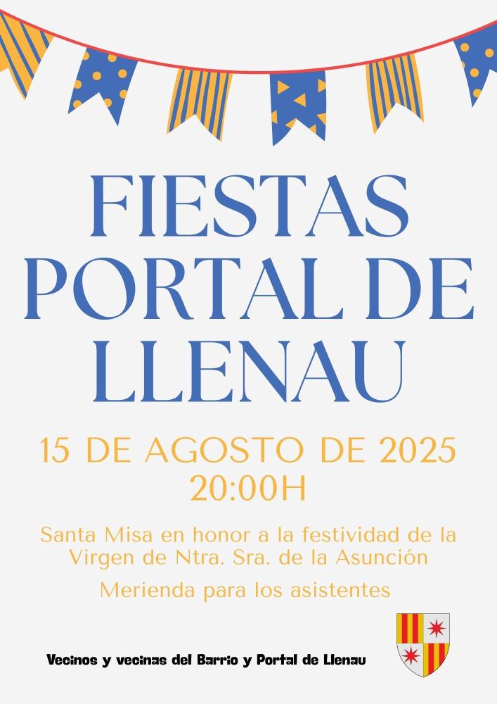 El viernes 15 de agosto, a las 20:00h, los vecinos y vecinas del Barrio y Portal de Llenau, invitan a vecinos y visitantes a participar en la Santa Misa en honor a la festividad de la Virgen de Ntra. Sra. de la Asunción y posterior merienda.