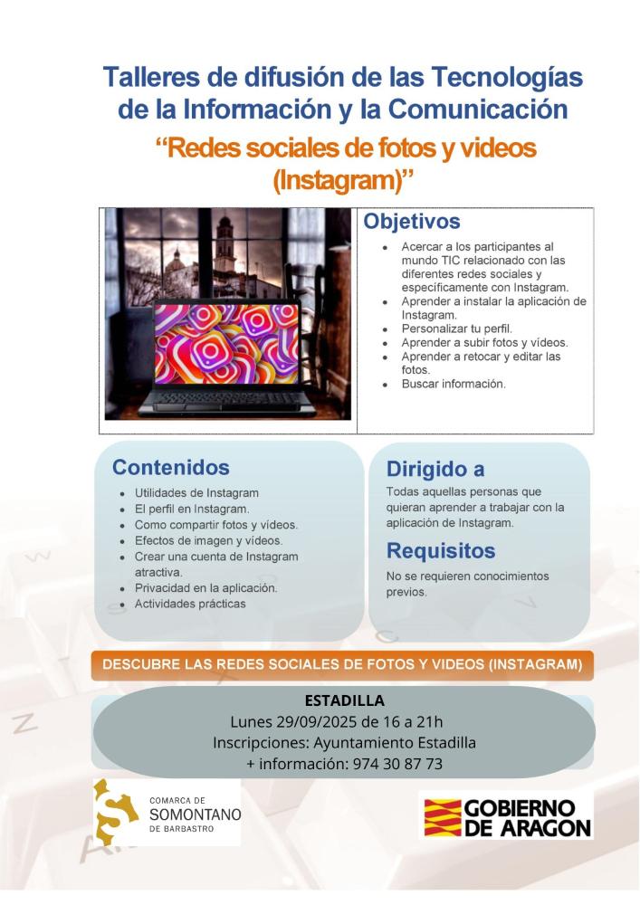 El próximo lunes 29 de septiembre, de 16:00 a 21:00 h, el Servicio de Juventud de la Comarca de Somontano organiza un taller de difusión de las TIC en Estadilla: “Redes sociales de fotos y vídeos (Instagram)”.