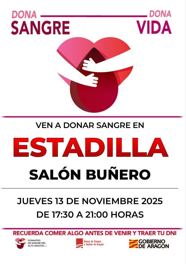 La Asociación de Donantes de Sangre del Alto Aragón informa que el próximo jueves 13 de noviembre, de 17:30h a 21:00h, se desarrollará la campaña de donación de sangre en el Salón Buñero.