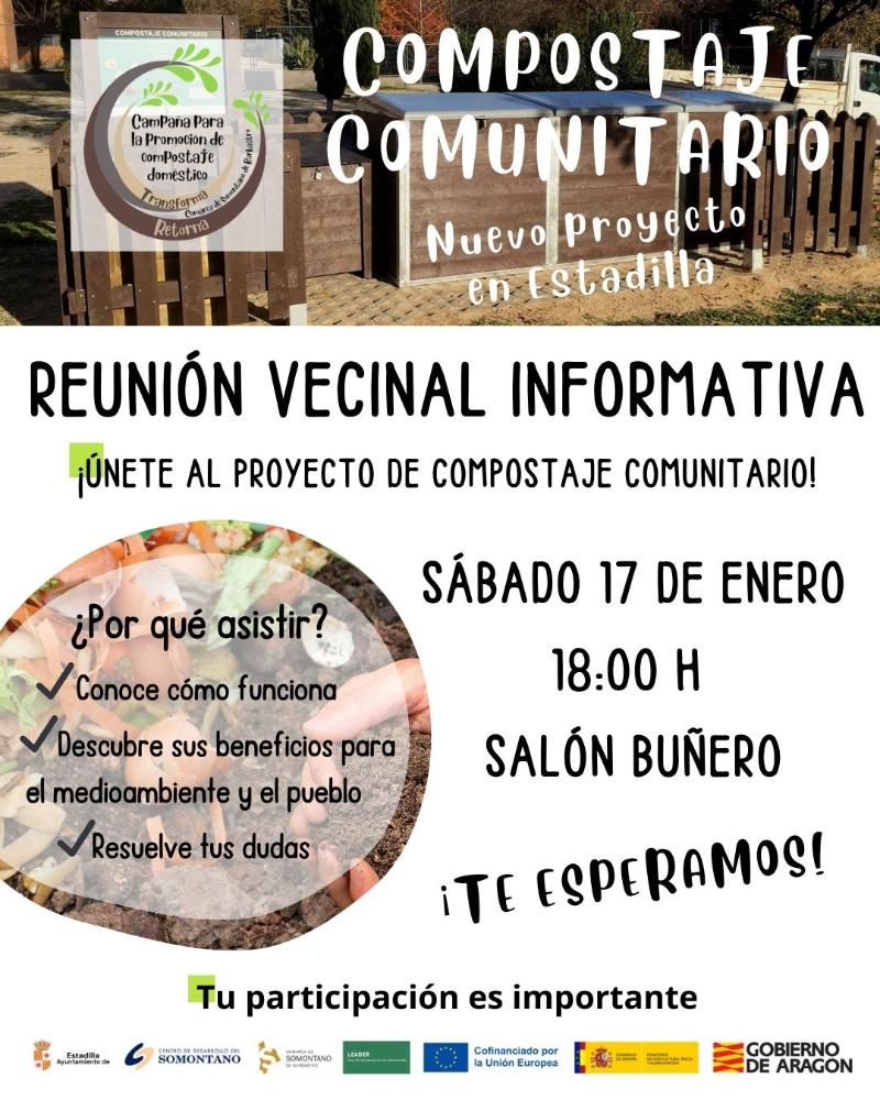 El Ayuntamiento de Estadilla invita a todos los vecinos y vecinas a participar en un encuentro informativo y participativo sobre la puesta en marcha de la nueva zona de Compostaje Comunitario Doméstico del municipio. Te esperamos el sábado 17 de enero, a las 18:00 horas, en el Salón Buñero.
