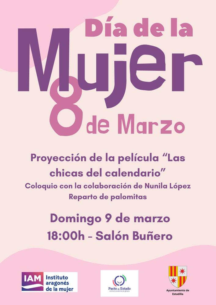 Con el objetivo de sensibilizar y poner en valor la importancia de la igualdad de género, el próximo domingo, 9 de marzo, en Estadilla, a las 18:00h en el Salón Buñero, se proyectará la película “Las chicas del calendario”. Al finalizar, haremos un pequeño coloquio con la colaboración de Nunila López. ¡Durante la película repartiremos palomitas!